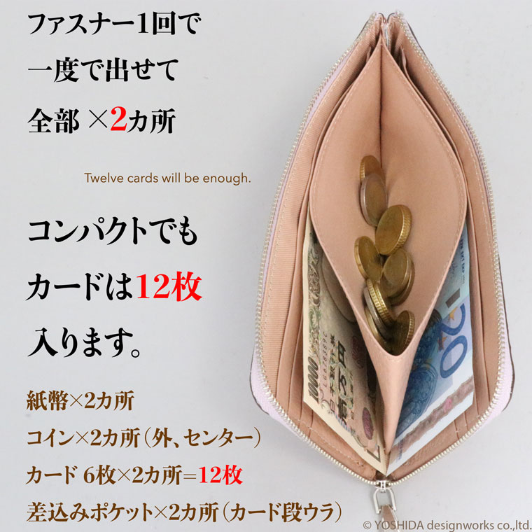 一度のファスナー作業で、お札、カード、コインまで全てが取り出せる機能的なスッキリ長財布です。